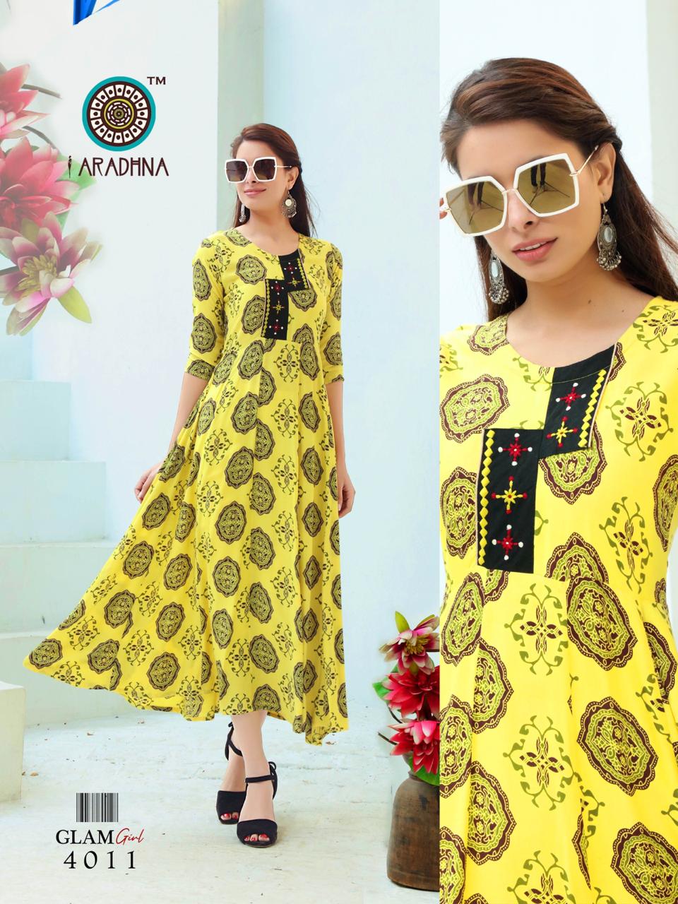 aradhna glam girl vol 4 beautiful rayon embroidered & handwork kurti catalog at wholesale rate