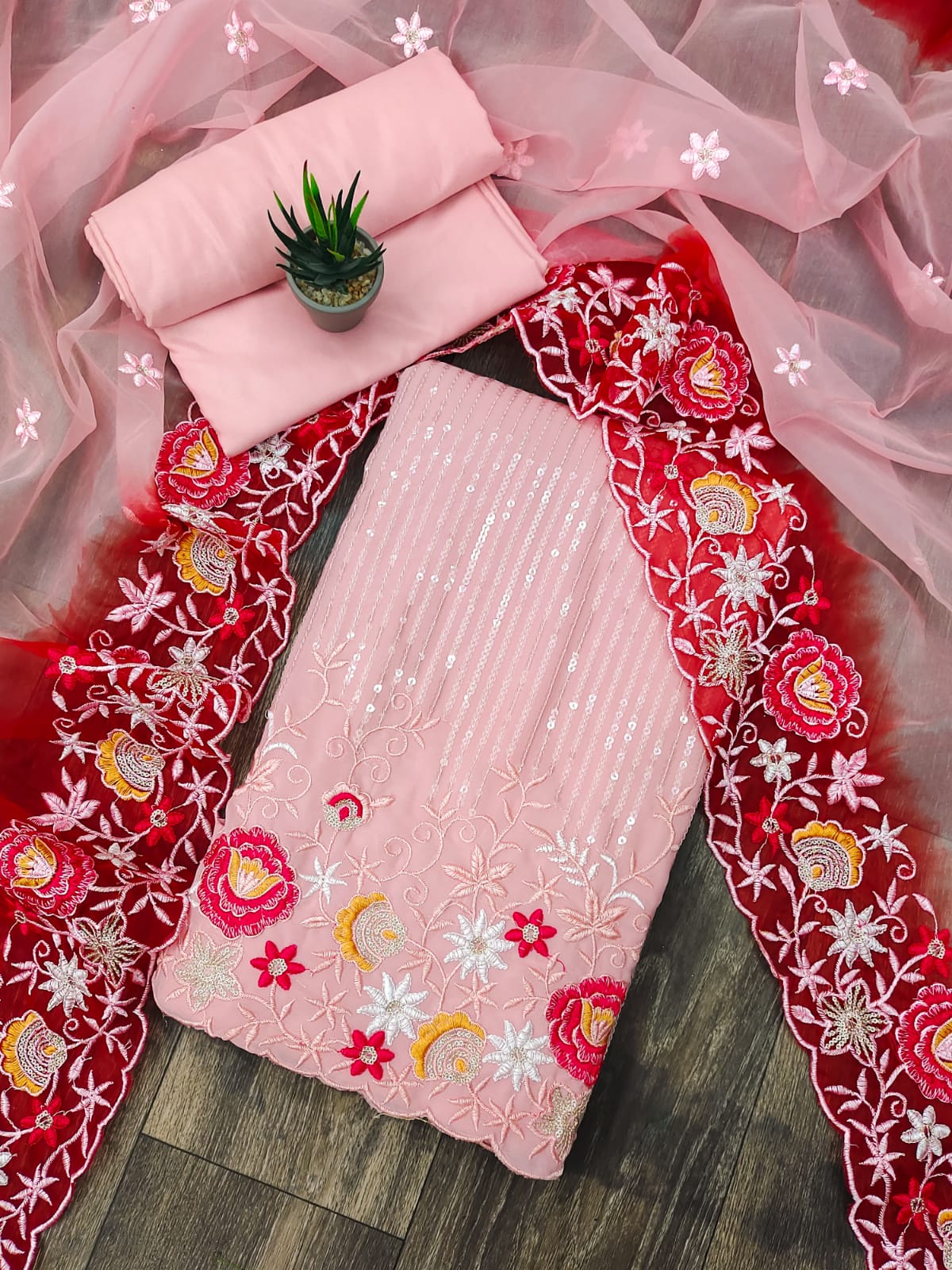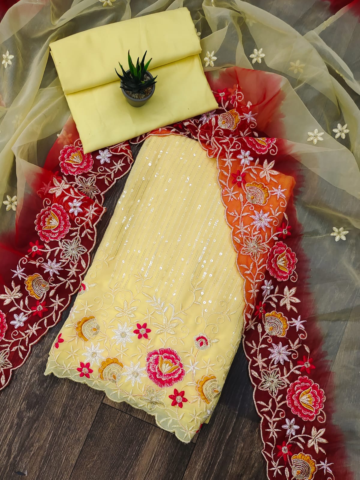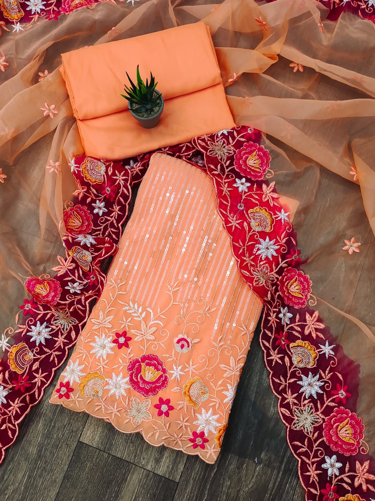 | NAME | Foux forget embroidery work with pure silk bottom and organza dupatta Dress Material Suit For Women |
