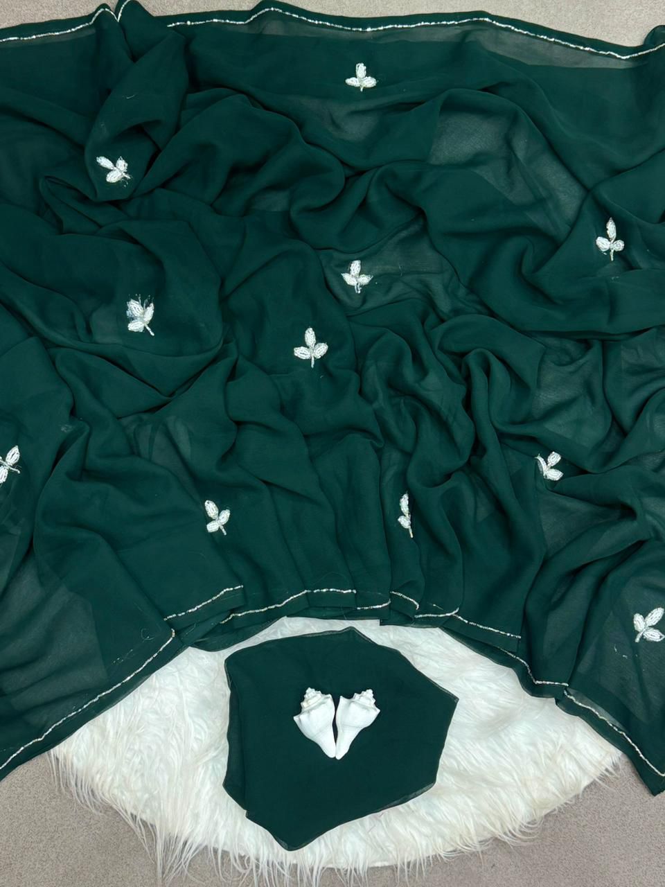 handwork leaf cut dana silver border dinner saree