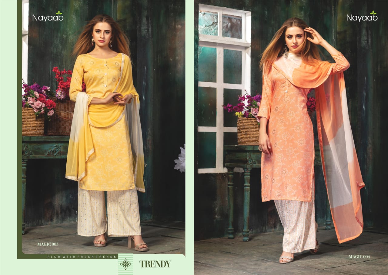 Nayaab Magic Heavy Rayon Dress Material Collection. | We are pleased to announce the launch of Nayaab, especially for designer ethnic wear collection. | Fabric Detail:- heavy rayon print fabric wd printed palazzo stitched And Nazneen dupatta fancy concept. | Plazo Stitched Free Size |