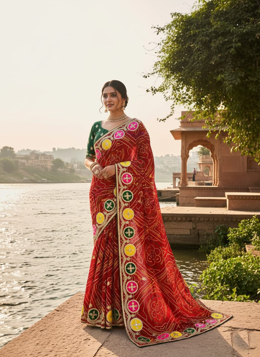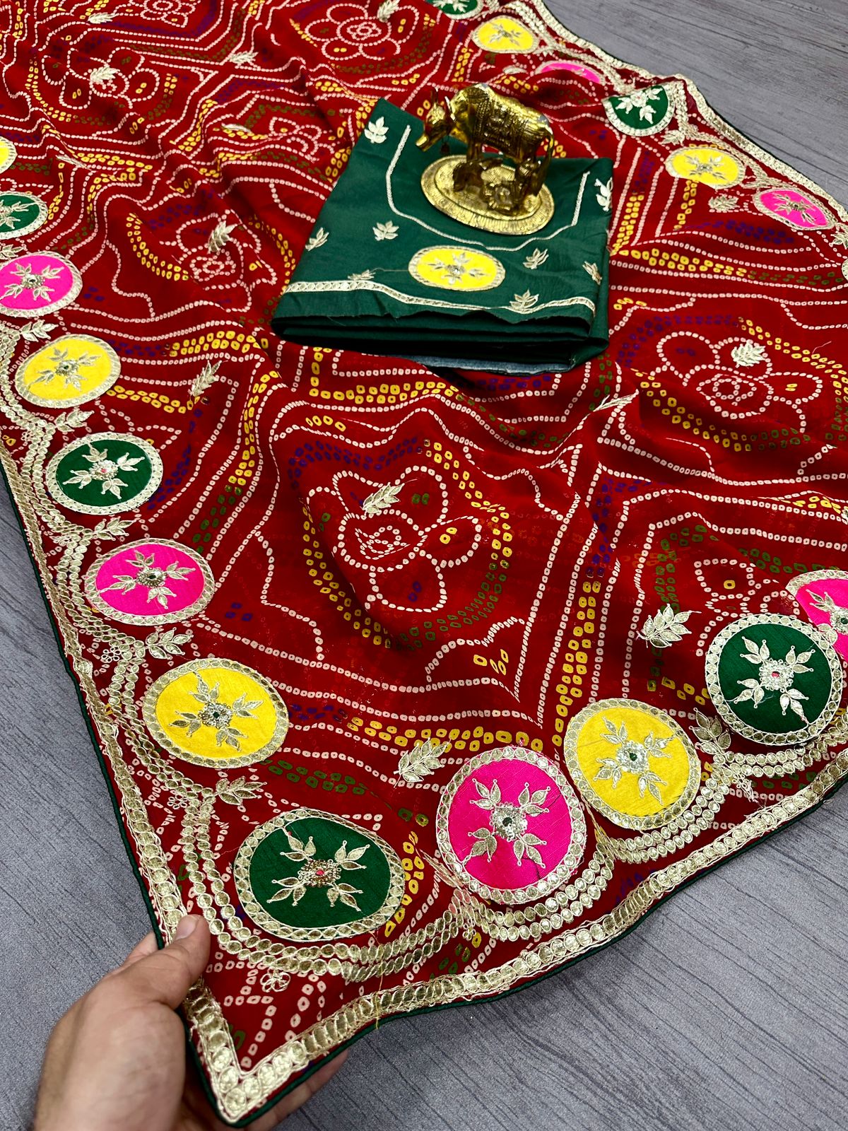 Saree :~ Pure Georgette with Jaipuri Bandhani Print Saree with Beautiful Gota Bangali Work in C~Pallu Work Border Saree