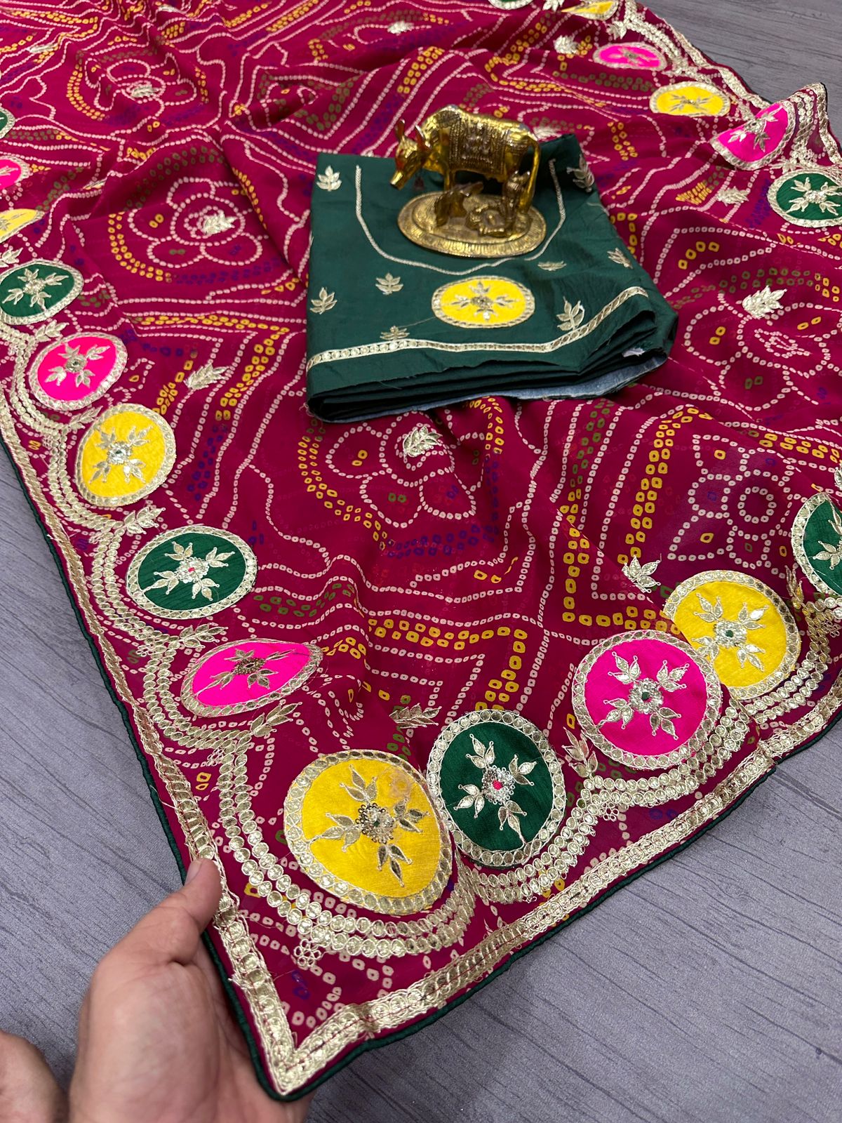 pure georgette with jaipuri bandhani print saree with beautiful gota