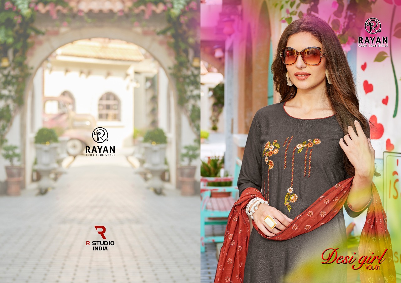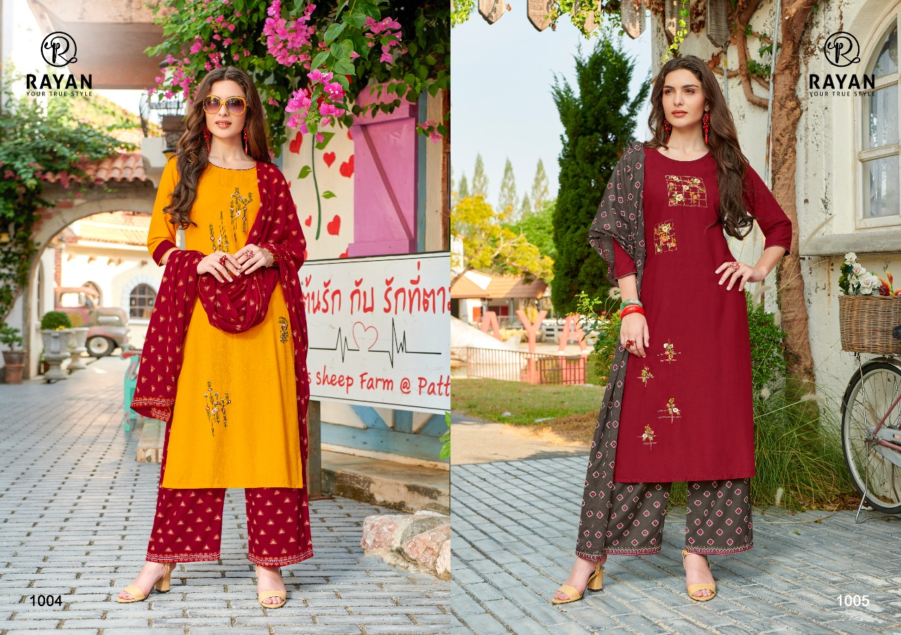 | NAME | R studio Rayan Desi -Girl Stylish Embroidery Heavy Rayon Stright Kurti with Plazzo Catalog ar Wholesale rate |