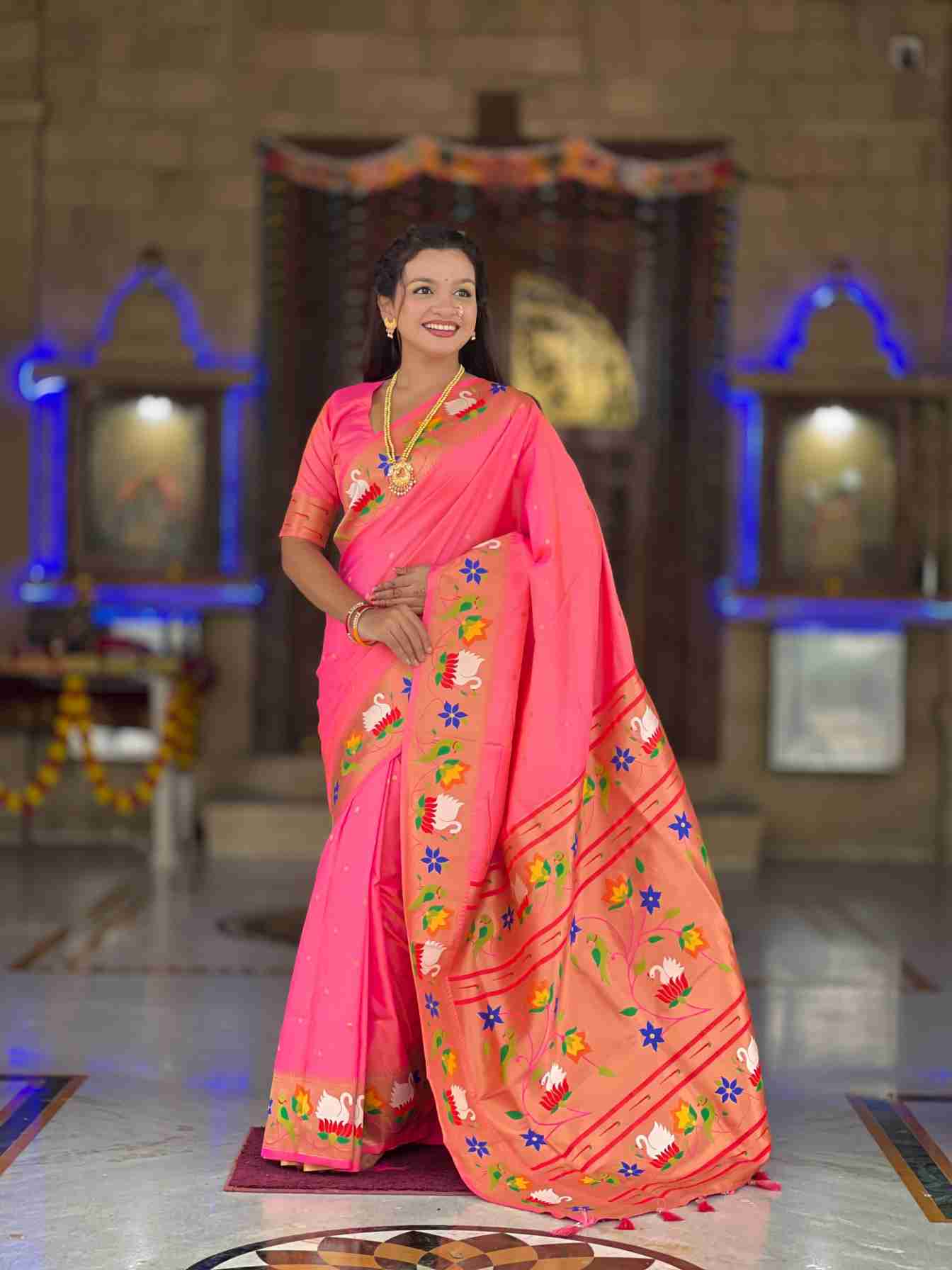 *Saree :-* Soft Pethani silk saree with zari weawing Motifs design and Meenakari weawing Rich pallu with Meenakari weawing swan border & Tessels attached at Pallu end.