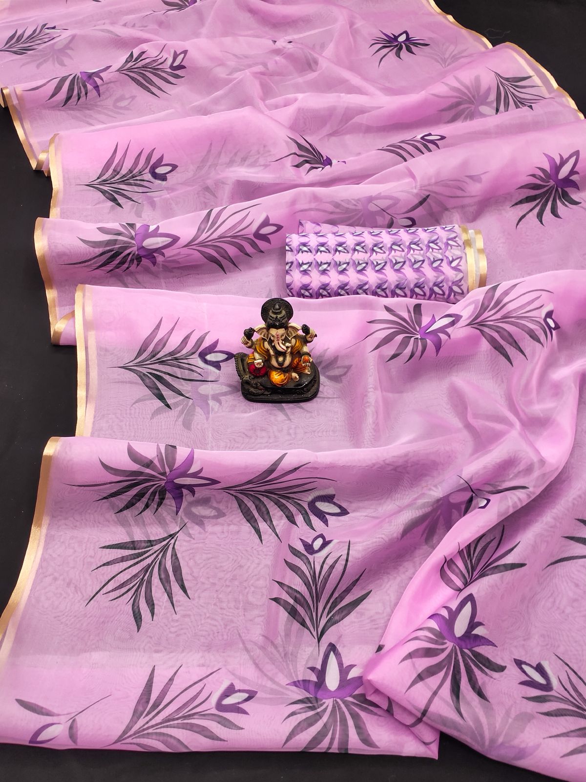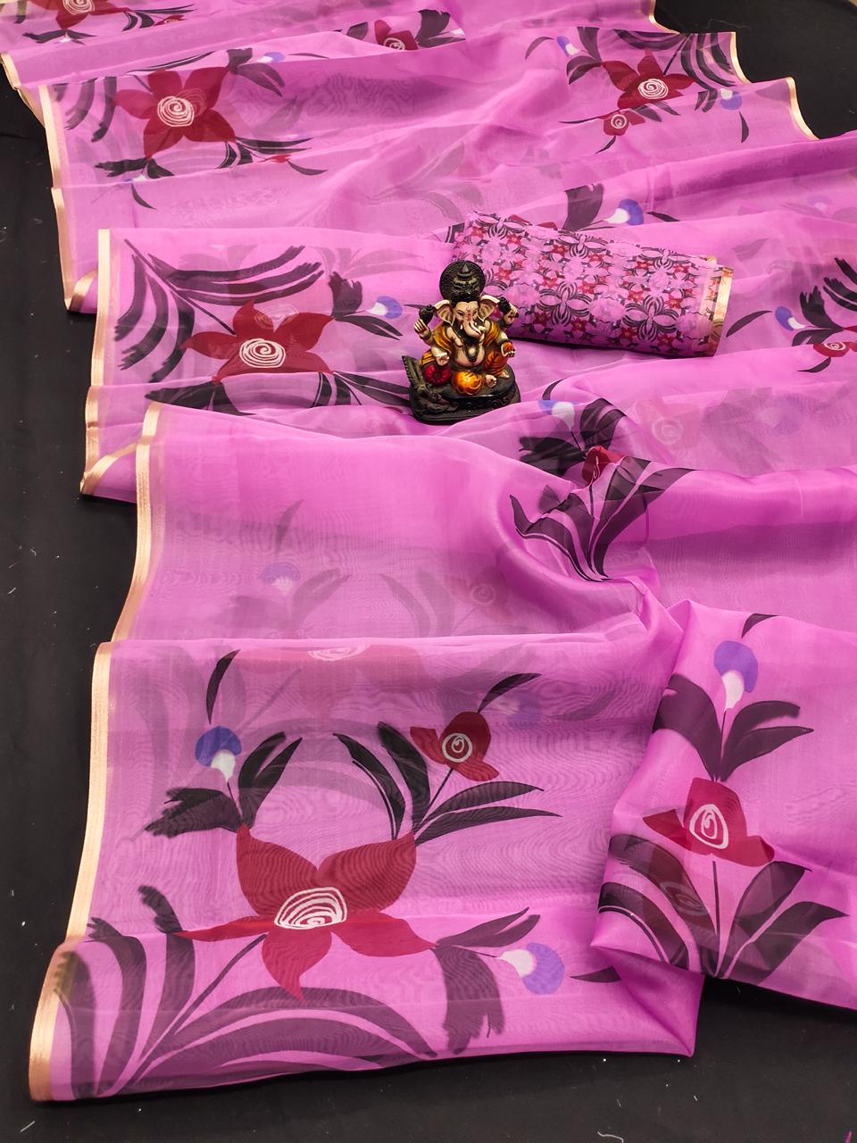 These Traditional And Classic With Best Quality Organza Digital Print Soft Shiny Art Silk Sarees With Inspired Gold Woven Borders Both Sides