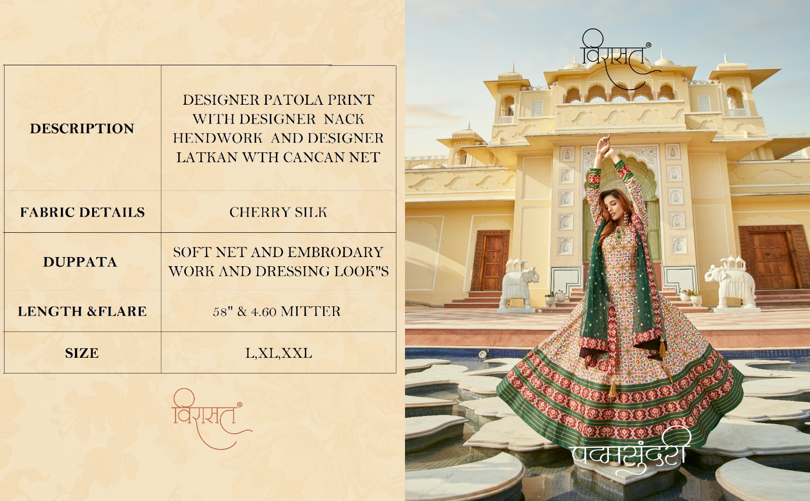 | NAME | Virasat PADMASUNDARI Cherry Silk Disigner Patola Print with Disigner Nack Handwork and Disigner Latkan WTH Cancan Net |